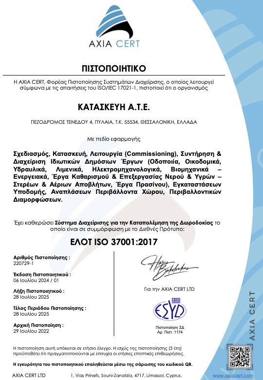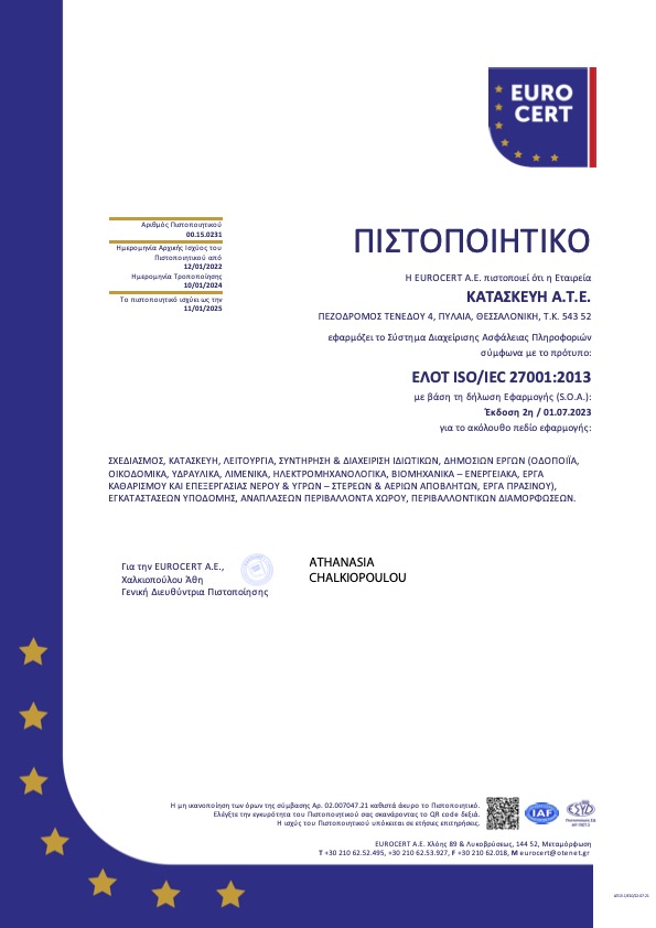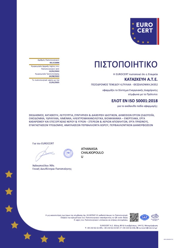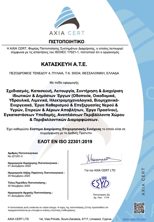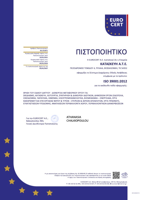 Διαθέτουμε όλες τις απαραίτητες πιστοποιήσεις που διασφαλίζουν την ποιότητα των υπηρεσιών μας και την τήρηση υψηλών προδιαγραφών ασφαλείας και περιβαλλοντικής ευθύνης. Η εταιρεία εφαρμόζει συστήματα διαχείρισης ποιότητας, τα οποία εγγυώνται τη συνέπεια, την αξιοπιστία και την υπευθυνότητα σε κάθε στάδιο εκτέλεσης των έργων που αναλαμβάνουμε.